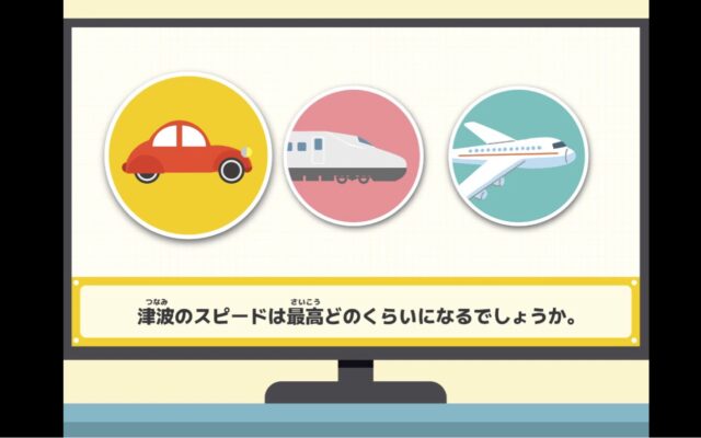具体的には、「火事になった時、消火器などで消火できる高さはどのぐらいまででしょうか」「火災の煙の速さで正しいのはどれでしょうか」「津波のスピードは最高どのぐらいになるでしょうか」など、実際の災害場面を想定した設問に、選択形式で回答していく。例えば津波のスピードへの回答は「車」「新幹線」「飛行機」などに置き換え、子どもたちにも数字などが伝わりやすい内容になっている。