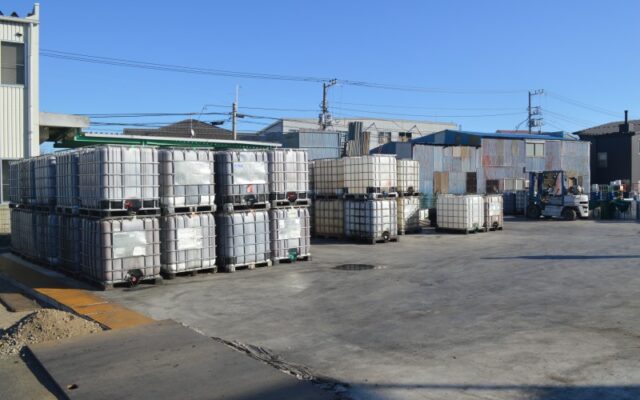 幹線通り沿いにある敷地はコンクリートで敷き詰められ、オイルの入れ替え等のために使用する回収缶がずらりと並び、一方にはオイルを保管・輸送するためのタンクが積み上げられていた。