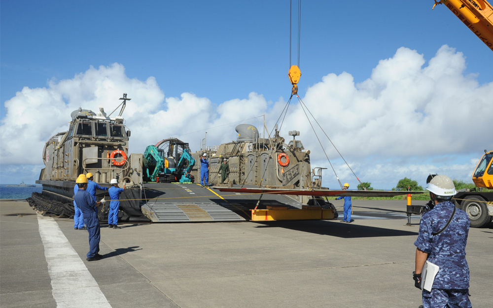 上は、沖合の輸送艦から、LCAC(エアクッション艇)で物資を陸揚げする様子。下は燃料を沖合の油槽船からホースをつなげて陸揚げする隊員たち